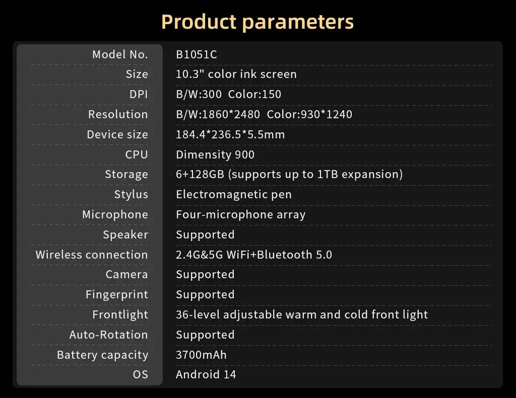 - You enjoy a 10.3-inch color E-Ink display with 2480×1860 (B/W) and 1240×930 (color) resolutions, plus a 36-level warm/cold front light for effortless reading in any lighting.