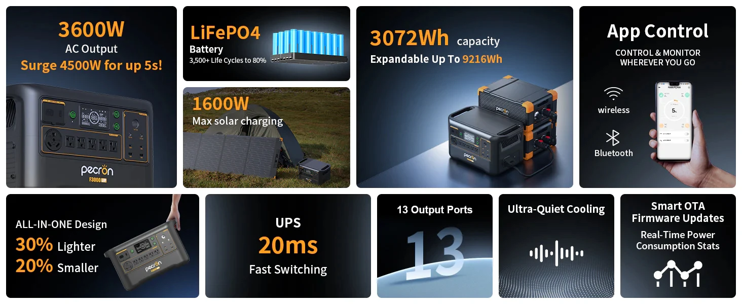 Pecron Portable Power Station F3000LFP 3072Wh Solar Generator 3600W LiFePO4 Battery Home Backup For Home Camping RV Emergency